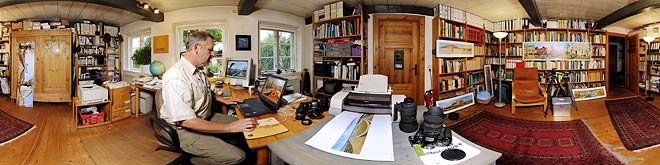 Fotograf Holger Schulz bei der Bildbearbeitung im Atelier im Storchendorf Bergenhusen. Hier entstehen aus den Bildern, die er im ganzen Land aufnimmt, auf seinen Rechnern die Panoramen des Projekts Schleswig-Holstein 360°