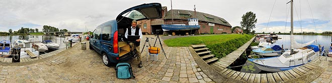 Fotograf Holger Schulz bei der Arbeit für das Projekt Schleswig-Holstein 360° am Eiderhafen von Pahlen. Sein Kastenwagen ist ihm nicht nur Transportmittel, sondern auch fahrbares Atelier und fahrbare Übernachtungsmöglichkeit.